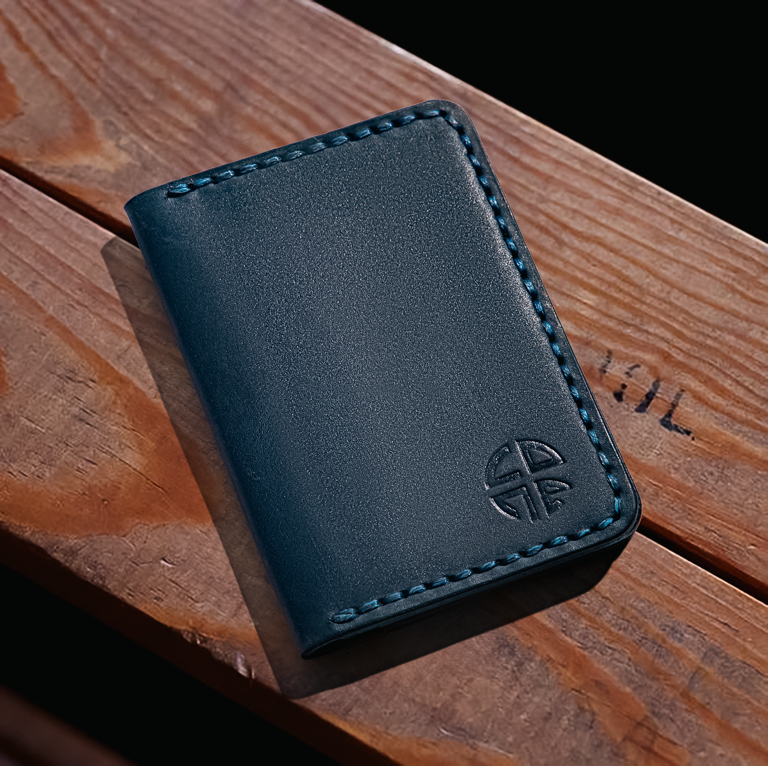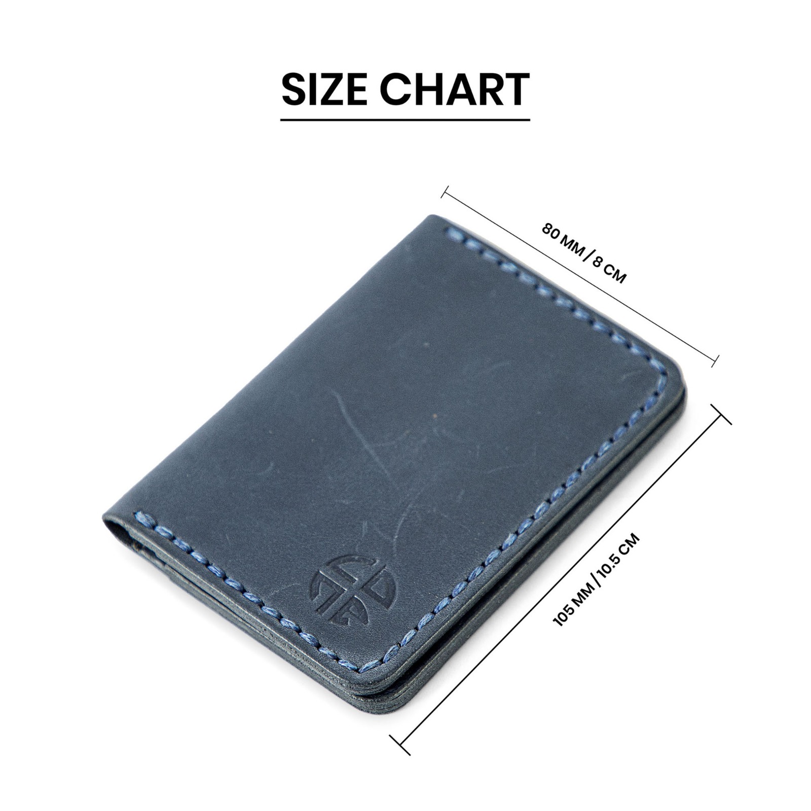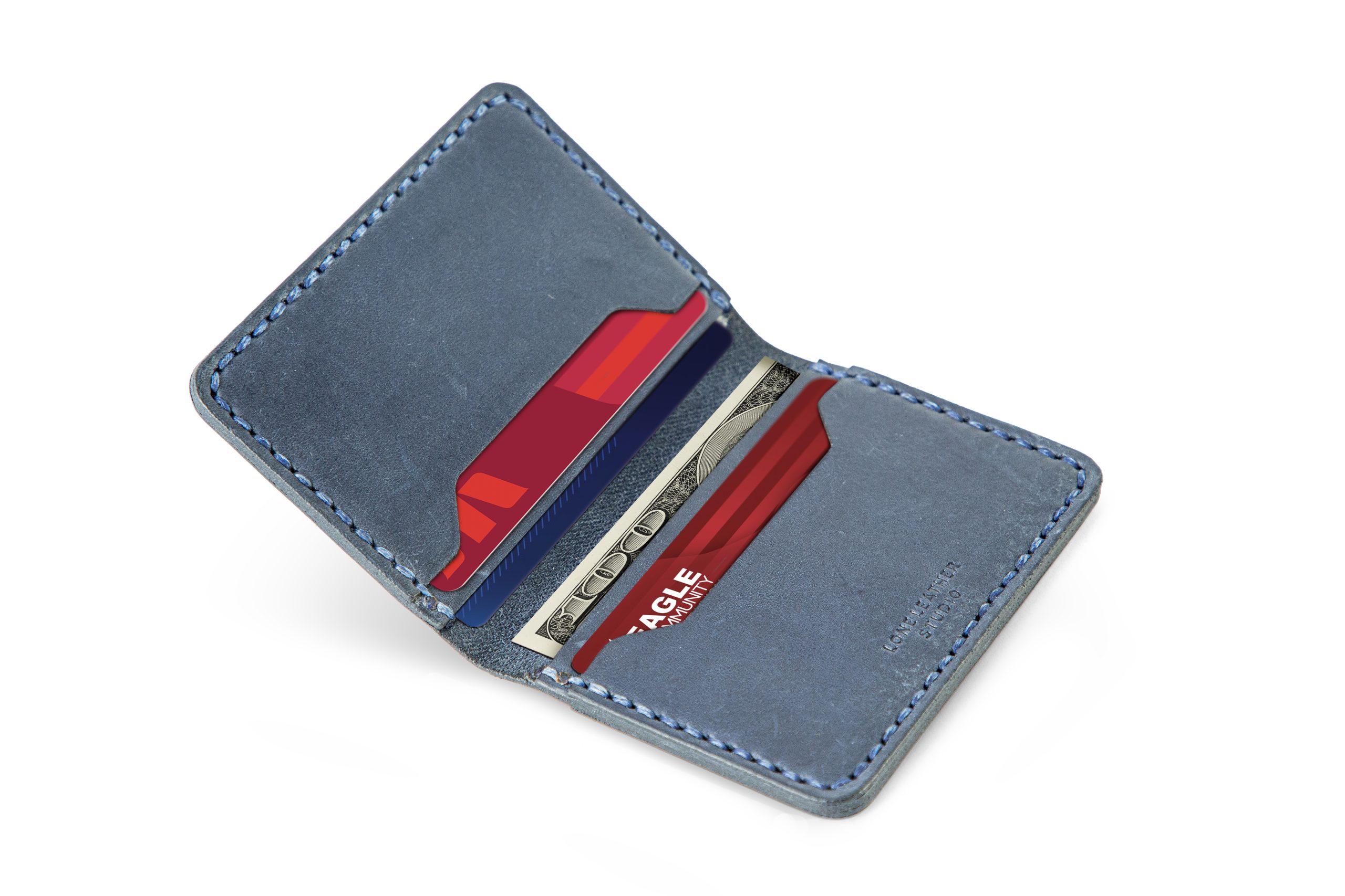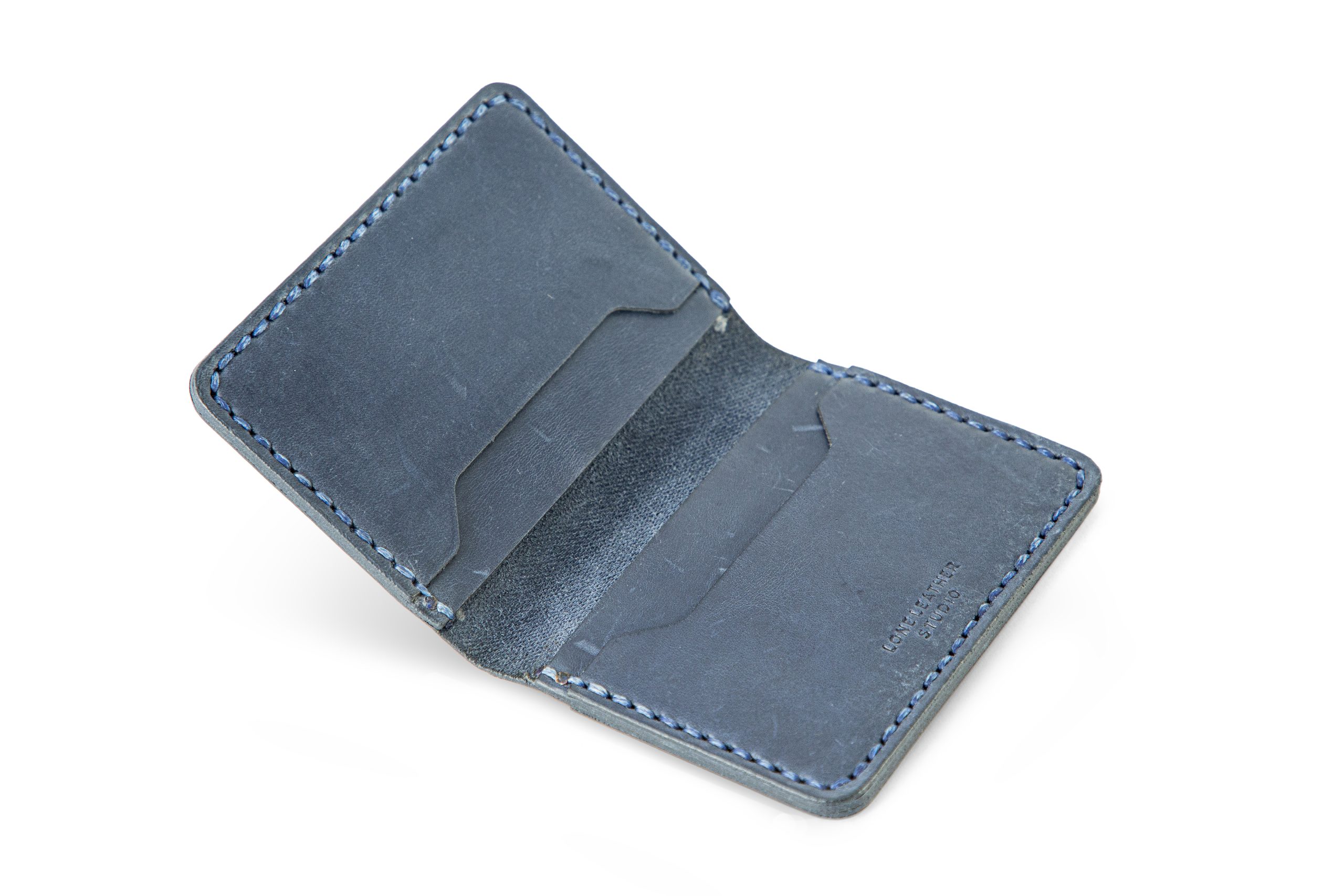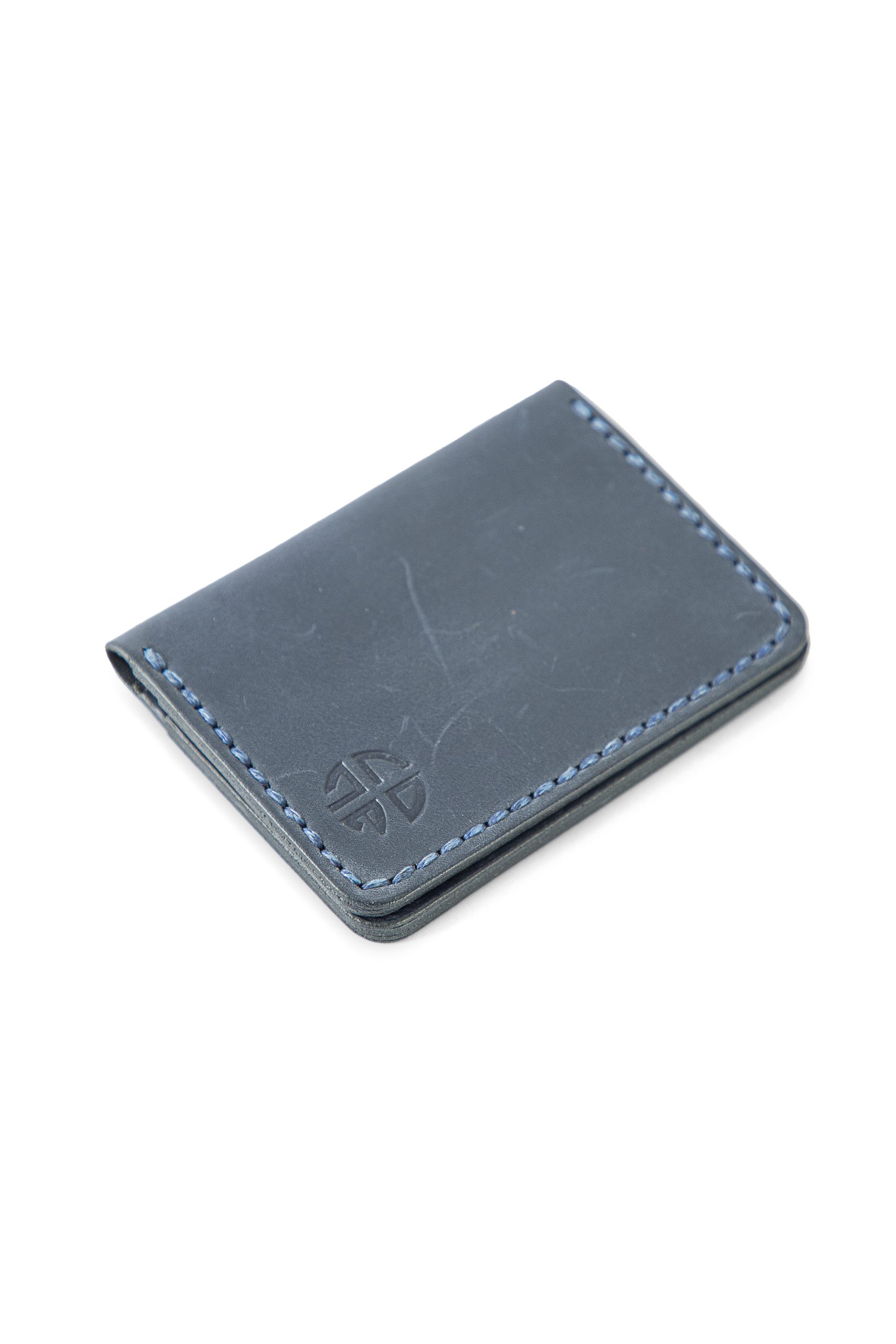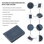 This is a handcrafted blue card holder combining style and practicality. It features 5 pockets (4 internal, 1 external), blue stitching details, and decorative side burnishing. The design emphasizes both aesthetics and functionality, offering a compact way to carry cards while showcasing artisanal craftsmanship.